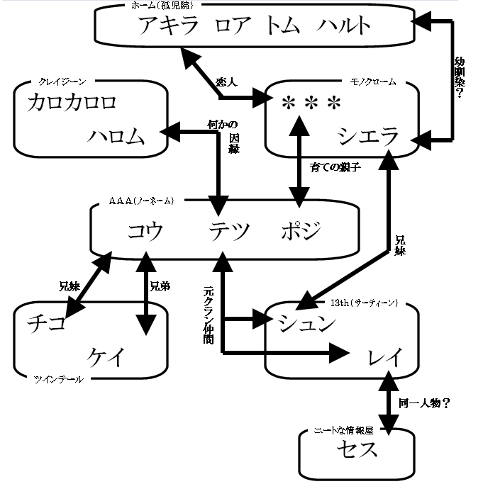 FFTA設定 設定 2014年03月14日 【設定】AAA(ノーネーム)● ポジ ● 16歳 (総受け:強気)職業)) 魔道師(気分によって色―つまり属性が変化)種族)) ン・モウ族と人間族の間の子外見)) 顔などは人間だが耳が長くン・モウ族特有のピアスをしているその他)) 混じる両種族からも迫害を受ける。 ***が育ての親。● テツ ● 21歳 (攻め:腹黒)職業)) ガンナー(趣味で時魔法やカラクリを少し)種族)) ヴィエラ族(スナイパー的)外見)) 特に指定なしその他)) かつてクラン最強と言われていた13th(サーティン)の1人。 クレイジーンのハロムとは因縁の仲。 ヴィエラ族で髪が黒かったため異端児扱いされ、孤児院育ち。● コウ ● 19歳 (リバ:ヘタレ(純真))職業)) シーフ & 闘士(ポジのサポートにより魔法剣が使用可能になる)種族)) 人間族外見)) 平々凡々。その他)) 非常に地味なキャラ。 それでも剣の腕はクラン内では一番。 幼い弟と妹がいるどっちかというと面倒見のいいお兄ちゃん的クレイジーン● カロカロロ ● ??歳 (受け:天然)職業)) 曲芸士 & メタモル士種族)) モーグリ族外見)) 特に指定なしその他)) とにかく何にかけてもAAA(ノーネーム)にちょっかいを出してくる。 様々なことに対して謎。ただし、純粋な馬鹿。● ハロム ● 23歳 職業)) 幻術士種族)) ン・モウ族外見)) 特に指定なしその他)) カロカロロの起こすバカ騒ぎを鎮める役回り。 テツとはなにやら因縁がある。ツインテール● チコ ● 10歳職業)) 弓使い & 白魔道師(でもケアルくらいしか使えない)種族)) 人間族外見)) 特に指定なしその他)) コウの妹。 兄よりしっかりしているところがある。● ケイ ● 12歳職業)) パラディン種族)) 人間族外見)) 特に指定なしその他)) コウの弟。モノクローム● *** ● 24歳 (総攻め:鬼畜(人による))ジークレイン レイン セツキ セス など過去に使用職業)) スナイパー(時々アサシン) & 白魔道師 種族)) ヴィエラ族と人間族の間の子(能力はヴィエラ)外見)) 髪はヴィエラ族特有の白で長く後ろで一本に縛っていたが、途中で切られるその他)) ホーム(孤児院)の出でポジの師匠的存在。 現在はシエラの兄探しに付き合ってクランで旅をしているが、ホーム(孤児院) にアキラという恋人がいる。● シエラ ● 12歳 (ハルト一筋)職業)) 生粋の闘士種族)) バンガ族と人間族のクォーター(バンガ25%、人間75%)外見)) 黒髪で短髪その他)) 能力や性格はともにバンガ族の特徴を継いでいる。 13th(サーティン)のメンバーの1人だったシュンの妹。 ホーム(孤児院)で暮らしていたが行方不明になった兄を探すために旅立つ。 ホーム(孤児院)にいるハルトとは微妙な間柄。その他● セス ● 28歳 (リバ:策士)職業)) 情報屋種族)) モーグリ族とン・モウ族のハーフ(仮)外見)) モーグリの外見で腹黒い(ン・モウ的) ⇒ 魔法系その他)) サク御用達の情報屋。 実はその正体は13th(サーティン)のメンバーであったレイという噂。● アキラ ● 24歳 (サク一筋)職業)) 孤児院経営種族)) ン・モウ族とヴィエラ族の間の子(仮)外見)) ロップイヤー的な耳にピアス。その他)) ホーム(孤児院)で育てられ、少し前に前院長から引き継いだ。 幼馴染の***とは恋人同士。13th(サーティーン)【設定未定ゾーン】● テツ ● 15歳職業)) 未定種族)) ヴィエラ族外見)) 未定その他)) 特になし● シュン ● ??歳 (リバ)職業)) 未定種族)) 未定外見)) 未定その他)) シエラの実兄。 しかし13th(サーティン)解散後行方不明になる。● レイ ● ??歳職業)) 未定種族)) 未定外見)) 未定その他)) 13th(サーティン)解散後はどこぞで情報屋を営んでいるらしい。